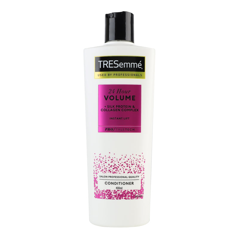 The TRESemmé 24 Hour Volume Conditioner is formulated to add volume and body to hair, making it look fuller and more voluminous for up to 24 hours. The 900ml bottle is a generous size, ideal for regular use. This conditioner is designed to provide lightweight conditioning without weighing the hair down, allowing for bouncy and manageable hair. It's suitable for fine or flat hair and works best when used in conjunction with the TRESemmé 24 Hour Volume Shampoo.